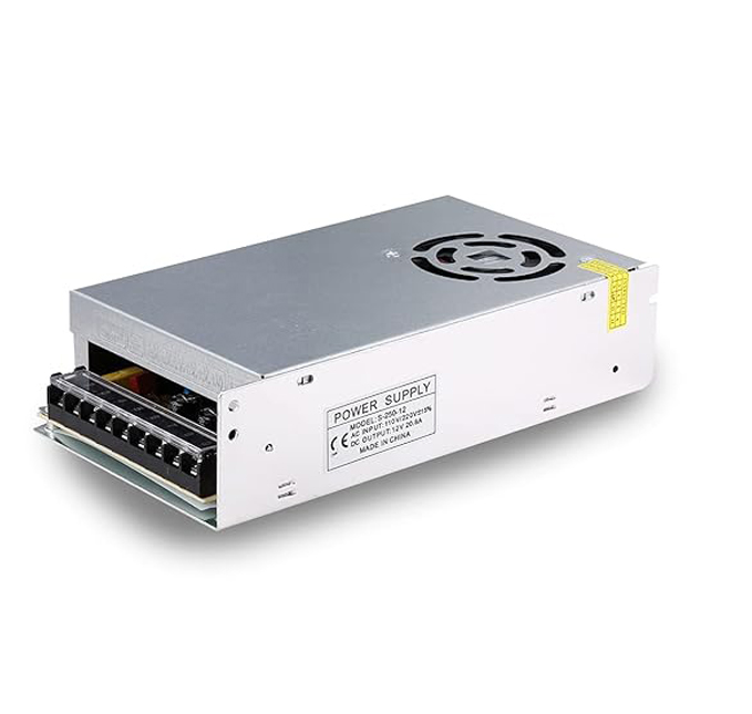 - تحويل مصدر الطاقة من تيار متردد 110 فولت/220 فولت إلى تيار مستمر 12 فولت 20 أمبير 250 واط: جهد الإدخال الافتراضي هو 110 فولت، جهد الخرج قابل للتعديل 10%، هيكل معدني به العديد من الثقوب يجعل تبديد الحرارة أكثر كفاءة.